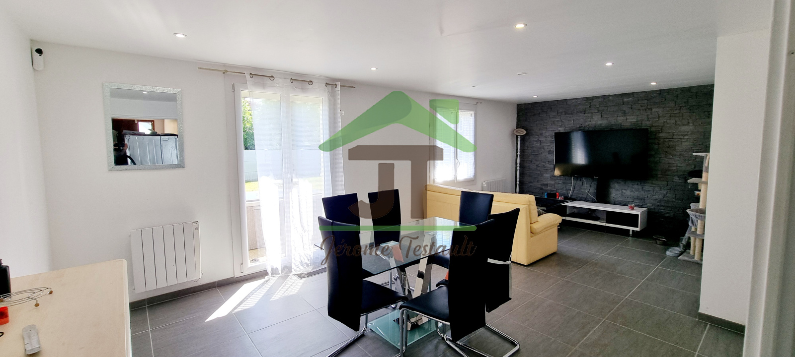 La maison s'ouvre sur une pièce de vie lumineuse de 27 m² exposée au sud, offrant un espace convivial et chaleureux pour se détendre en famille ou recevoir des amis. Une cuisine aménagée et équipée jouxte cet espace, offrant praticité et fonctionnalité au quotidien.