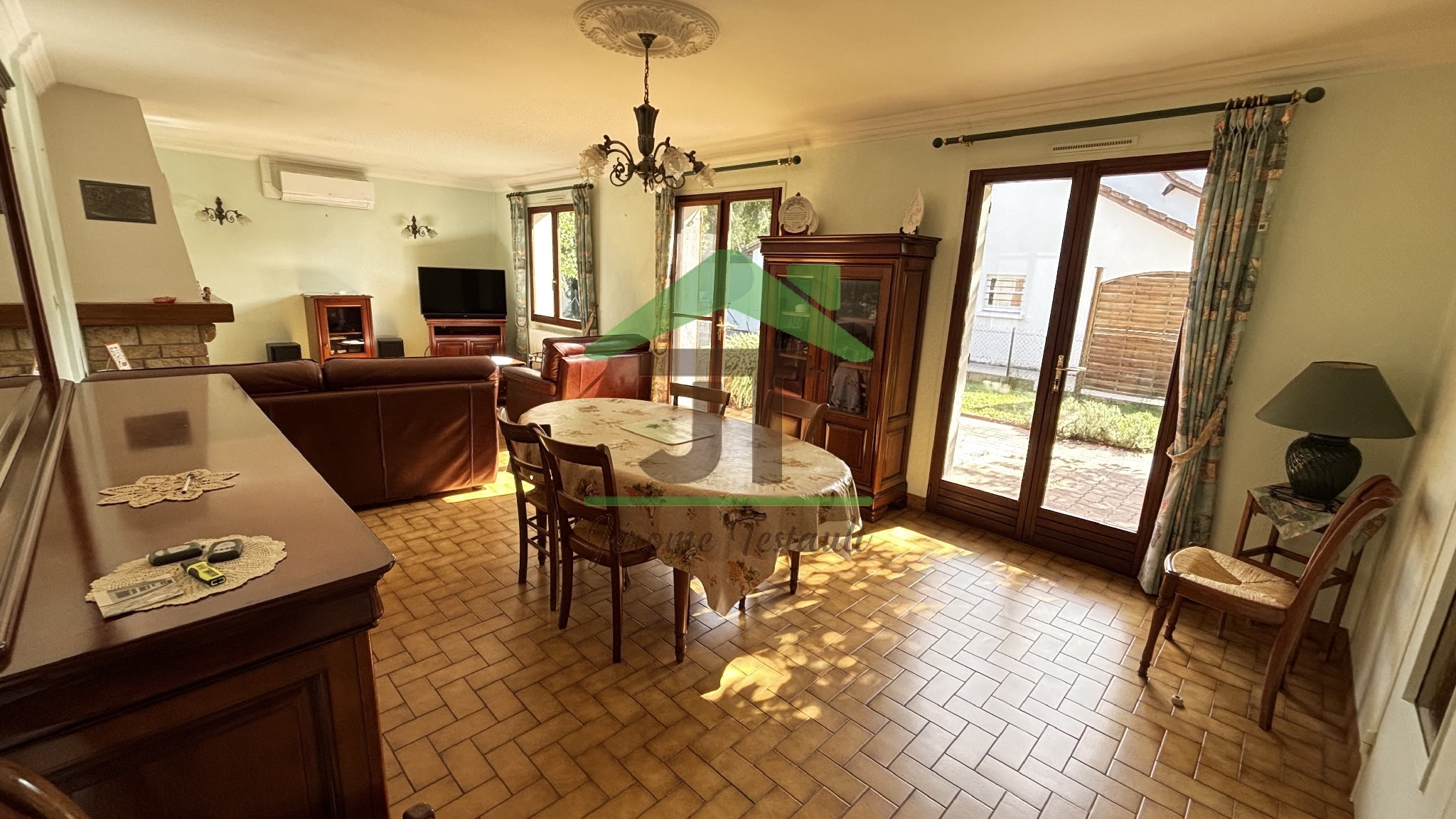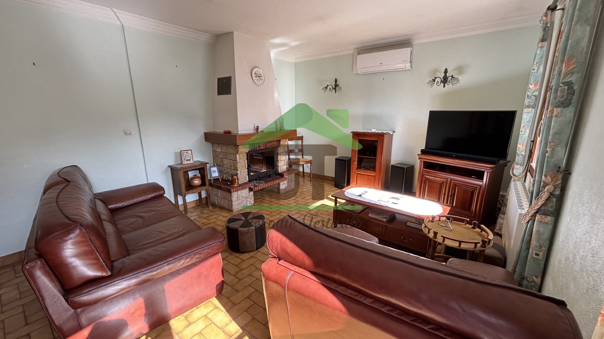 La maison dispose également d’un garage, de plusieurs modes de chauffage (climatisation réversible, radiateurs électriques, cheminée bois), ainsi que d’un raccordement au tout-à-l’égout.